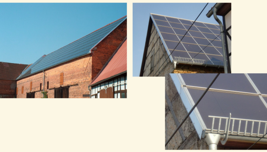 Indachsolarfelder mit rahmenlosen Modulen auf Landwirtschaftsdächern Gestelltyp Solid 1 (geschindelt) kristalline Module